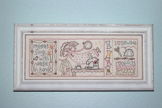 This stitchery design is provided pre-printed on seeded homespun fabric, with the pattern.
